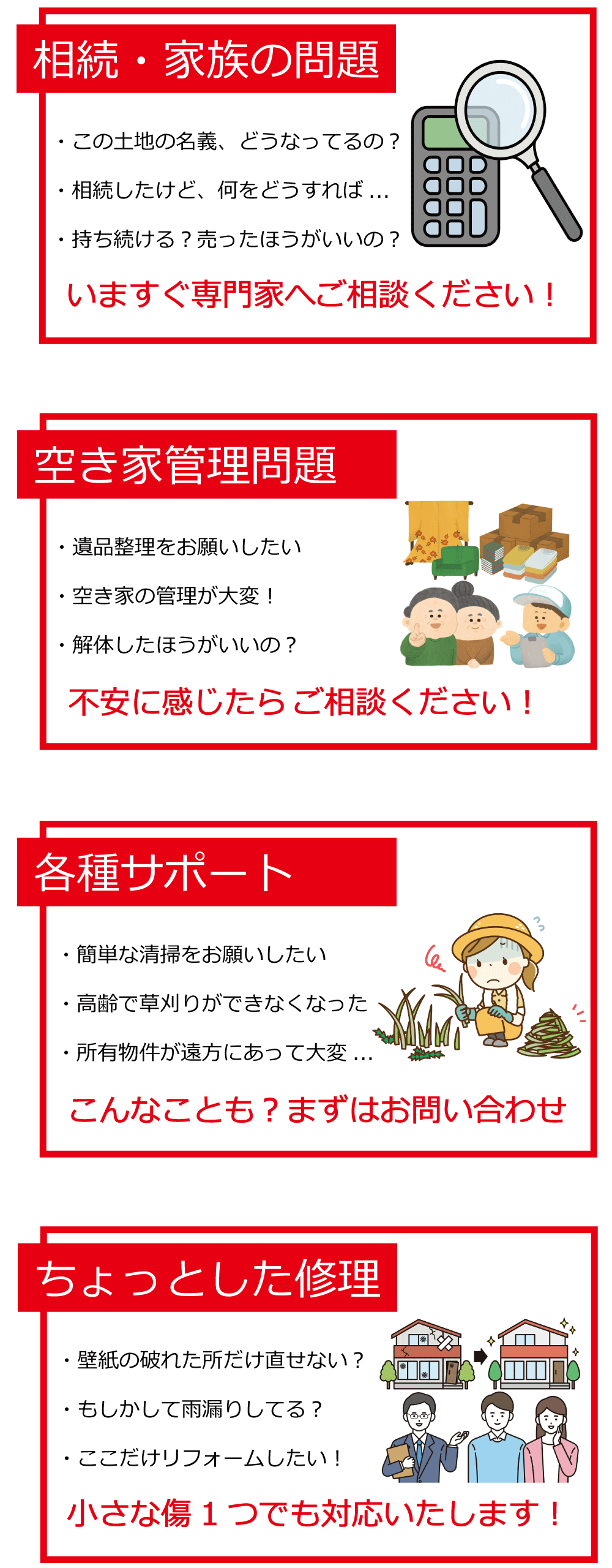 不動産の悩みは、「売る」「買う」だけではありません。空き家、相続、管理、リフォーム、解体、片付けにいたるまで実は、たくさんの“困りごと”がつながっています。